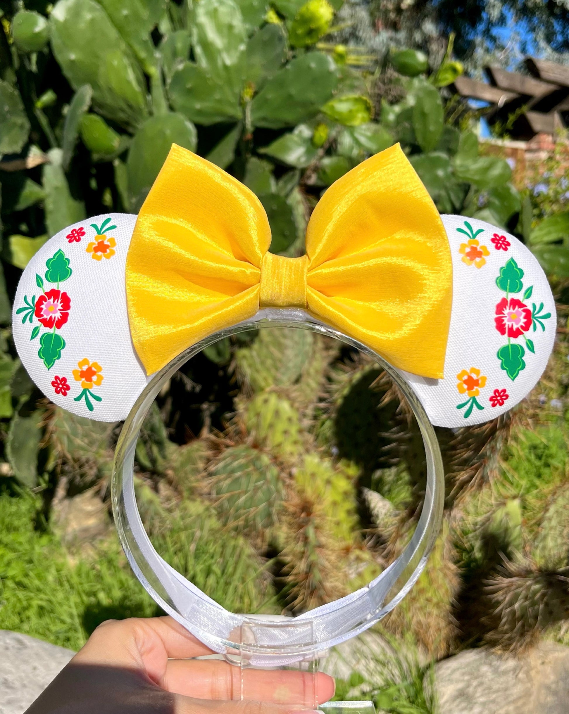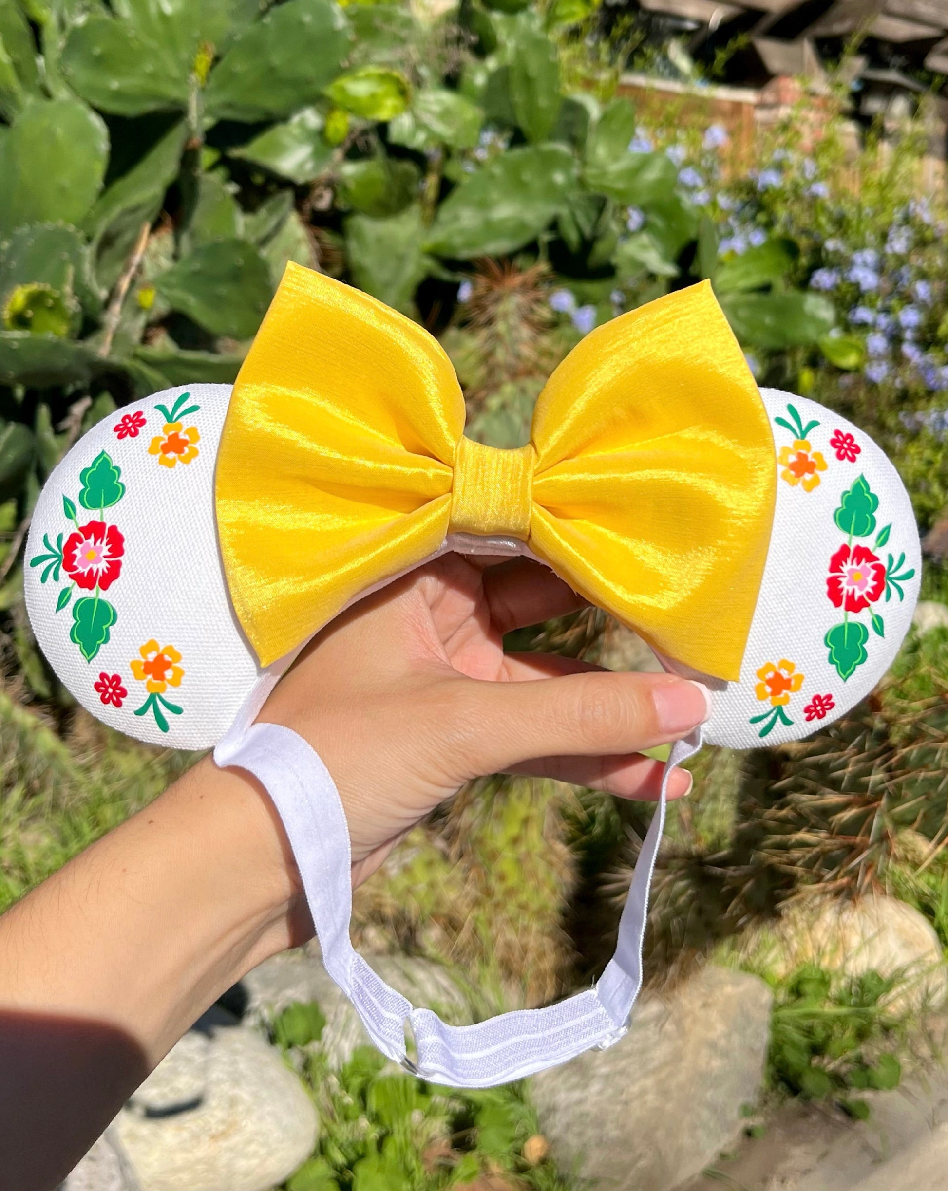 Allow your little one to proudly represent their roots and Mexican pride with our México Lindo Pixie Pair! These fabulously festive ears are made with white fabric and decorated with hand drawn florals that were transferred onto vinyl in vibrant colors. This pair is topped off with a magical red bow that gives off a sweet shimmer. These ears are made on an adjustable, stretchy and comfortable headband.